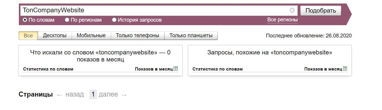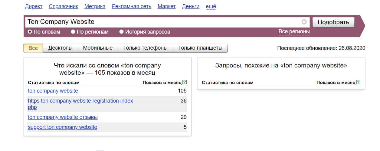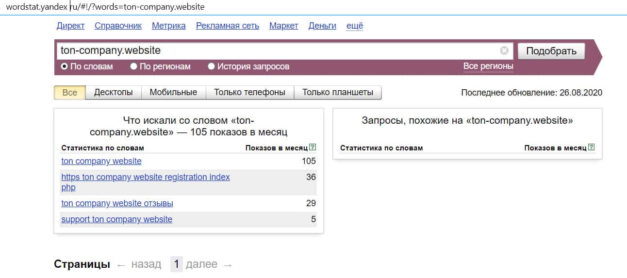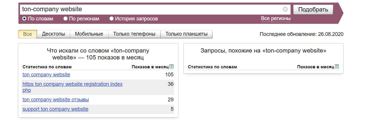 Название мошеннической конторы "TonCompanyWebsite", написанное на английском языке, пользователи совсем не искали в системе Яндекс, итог нулевой.