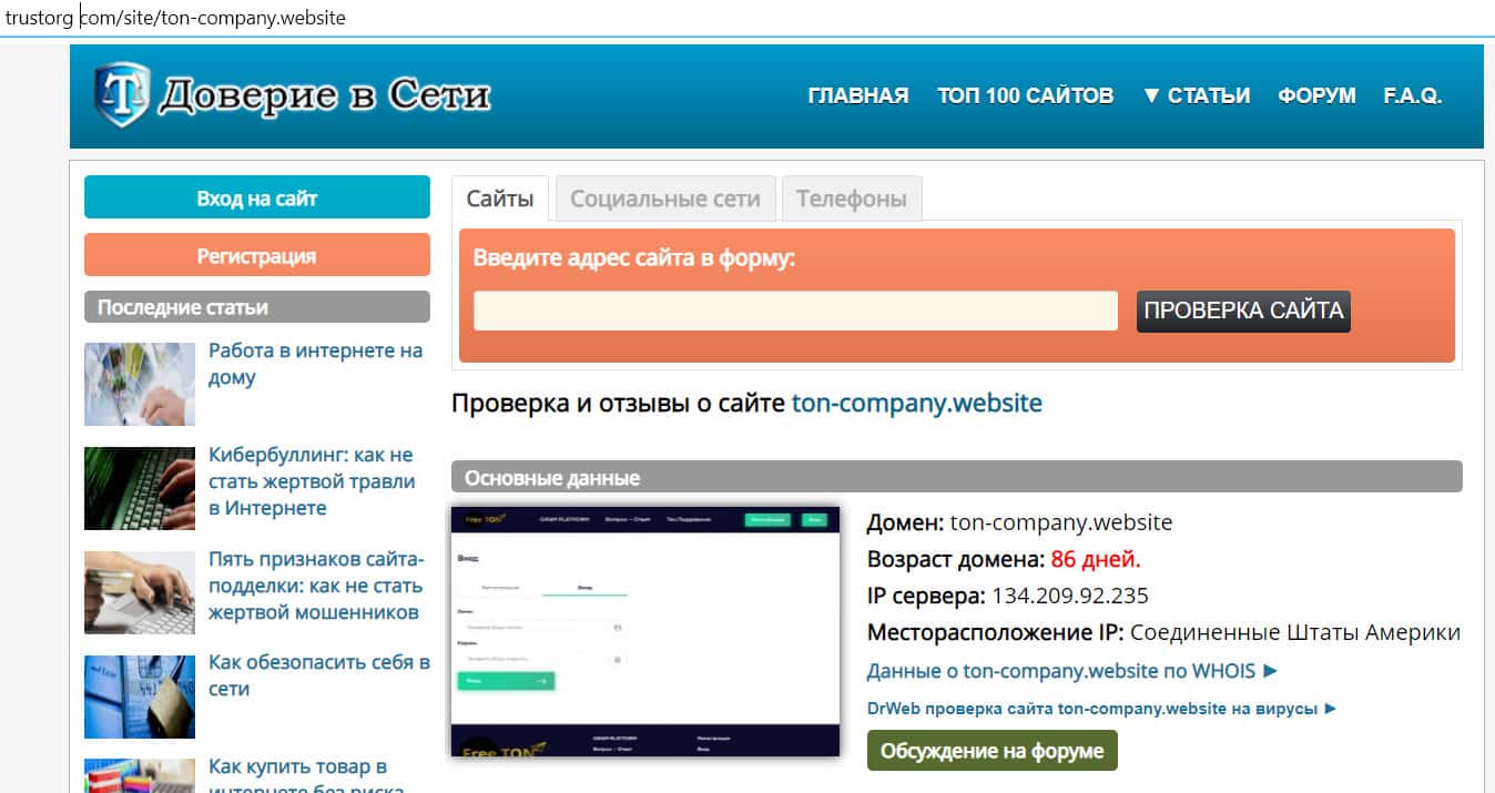 Возраст доменного имени сайта Ton-Company Website составляет 86 дней. Сайт создан пару месяцев назад, и доверять такой компании не имеет смысла.
