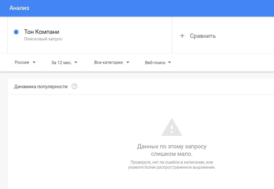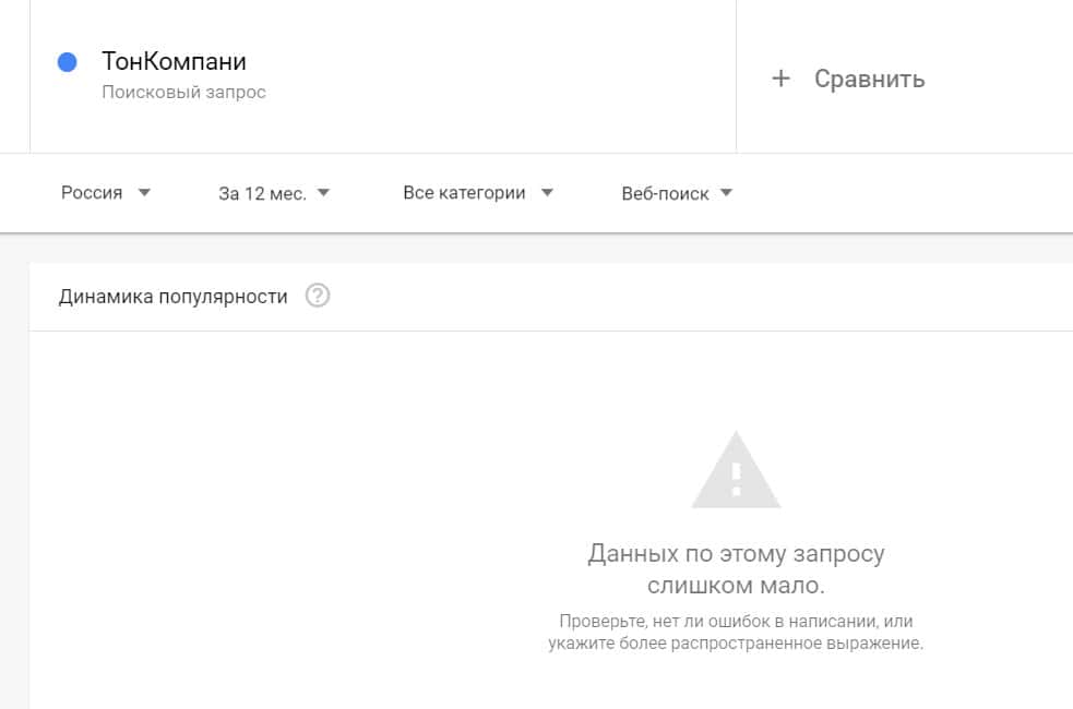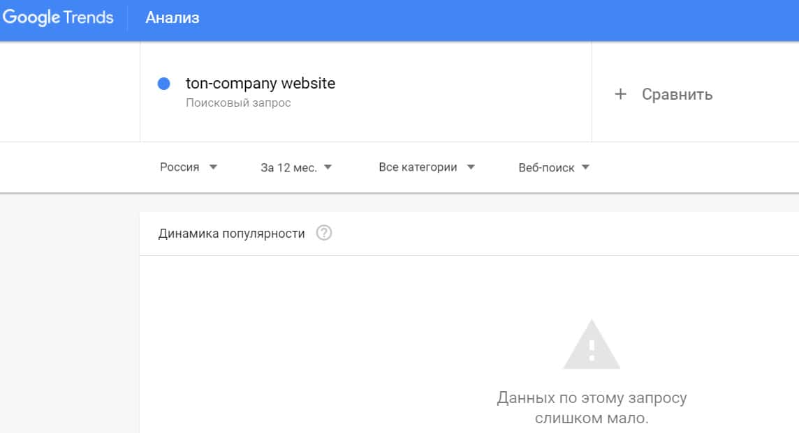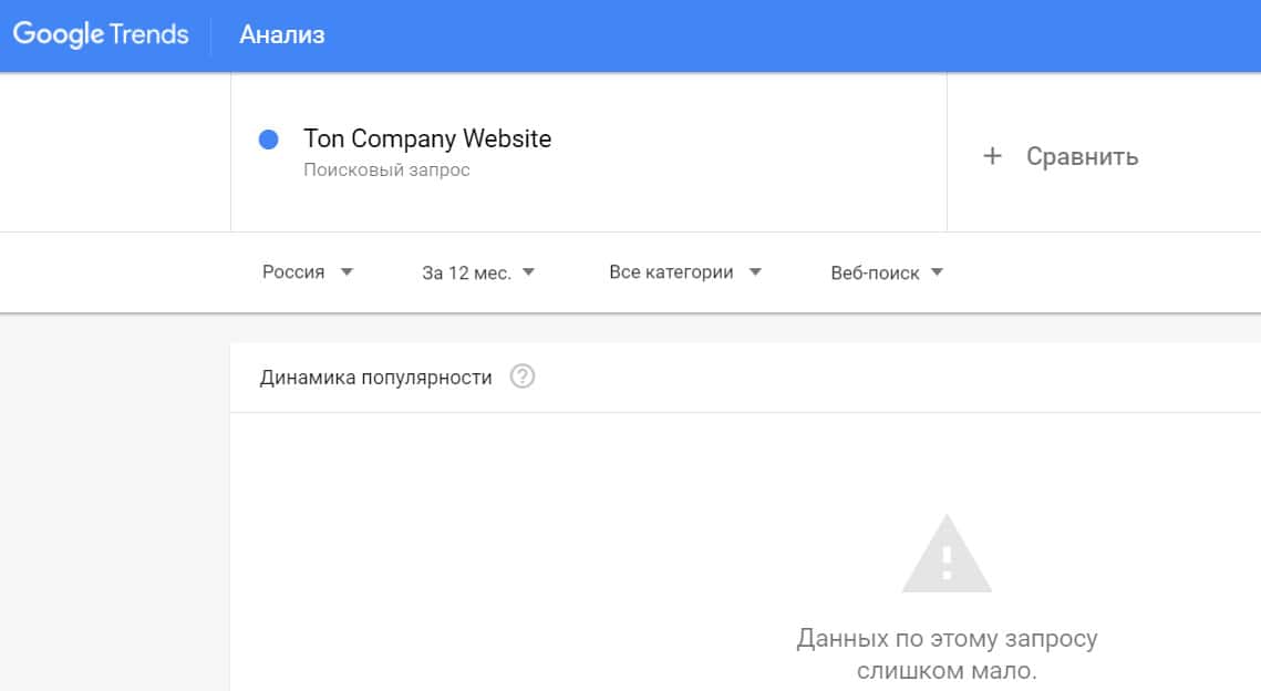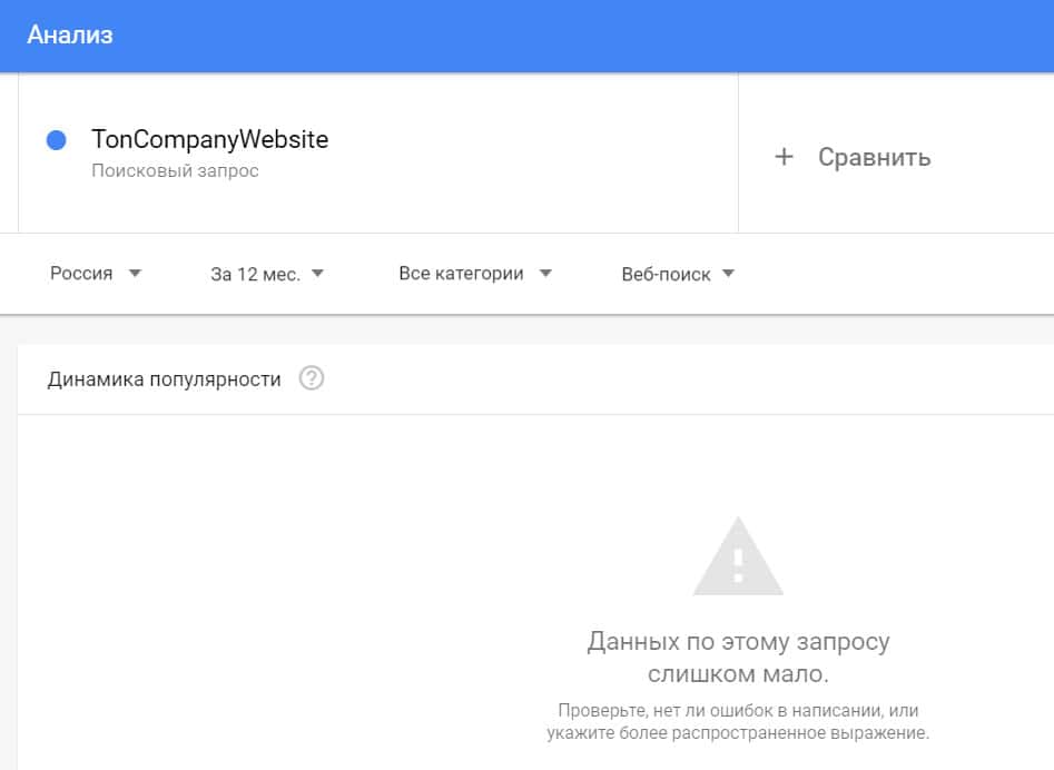 Посмотрим, насколько популярно название бренда "TonCompanyWebsite", написанное на английском языке. Данных по этому запросу нет, так как никто не искал этот бренд в Гугл.