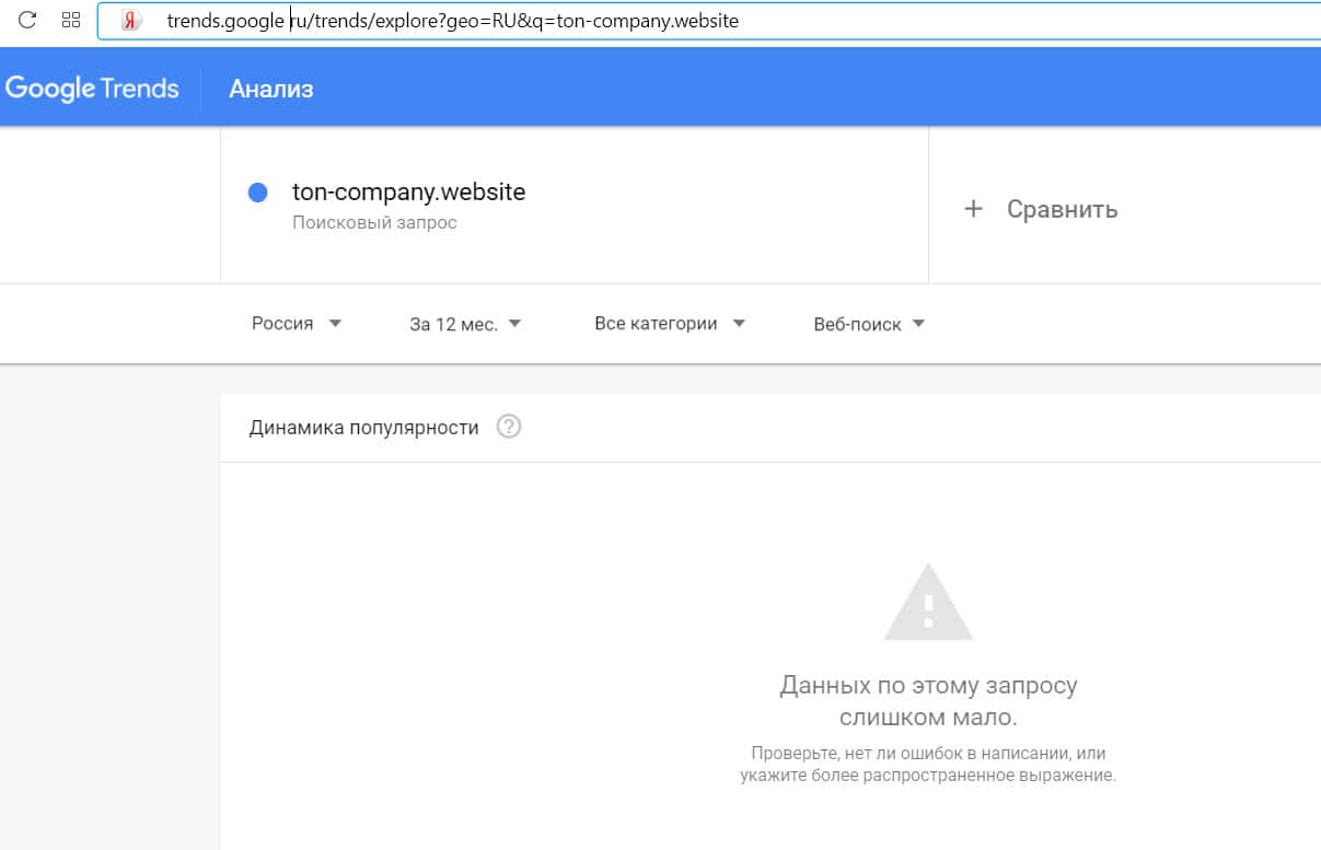 Количество запросов по домену "ton-company website", вбитого в поисковик Гугл без точки, с пробелом, также происходило крайне мало раз.