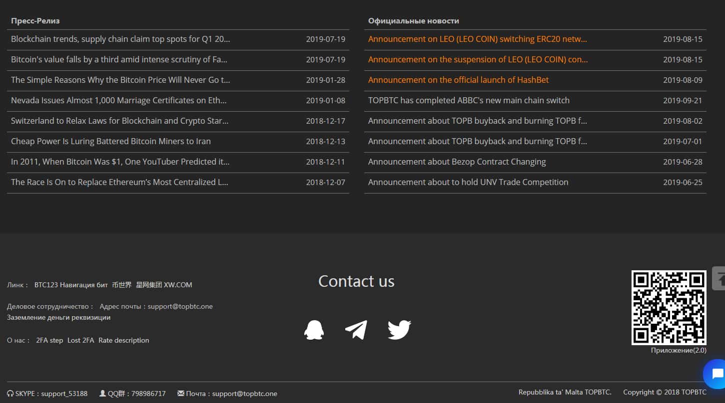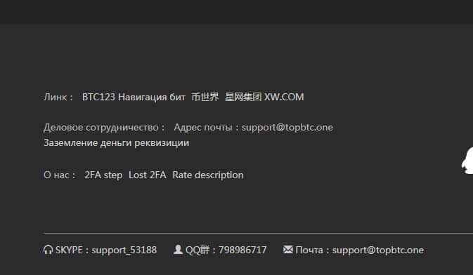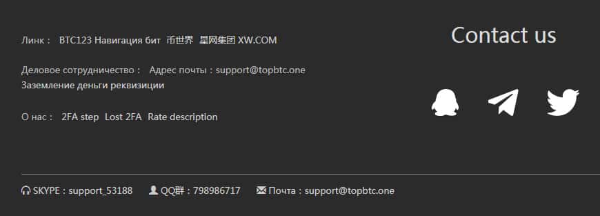 Под контакты мошенники Топ БТЦ не отвели отдельный раздел своего сайта, а попросту указали свои контакты в конце своего подвального сайта. Стоит отметить, что их у лохотрона TopBTC их крайне мало, а так же сами контакты у шулеров Топ БТЦ довольно сомнительные. Итак ниже перечислим контакты аферистов TopBTC: