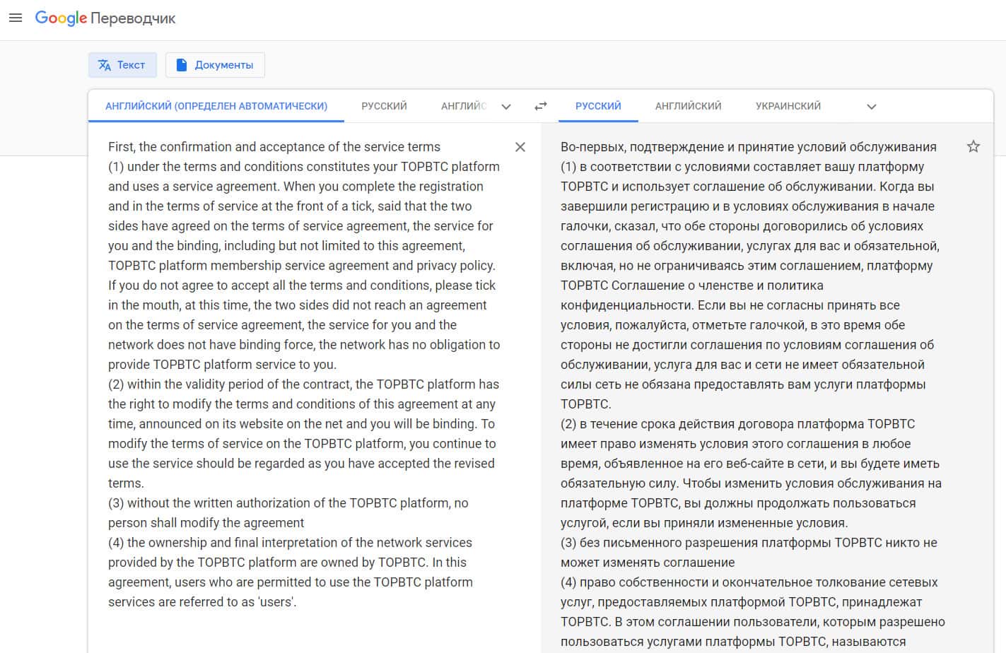 Несмотря на то, что сайт у аферистов TopBTC предоставлен на русском языке сами же условия сотрудничества у мошенников Топ БТЦ предоставлены на английском языке, что говорит об очередной халтуре со стороны жуликов TopBTC. На изображении, расположенном, ниже вы можете увидеть условия сотрудничества шулеров Топ БТЦ.