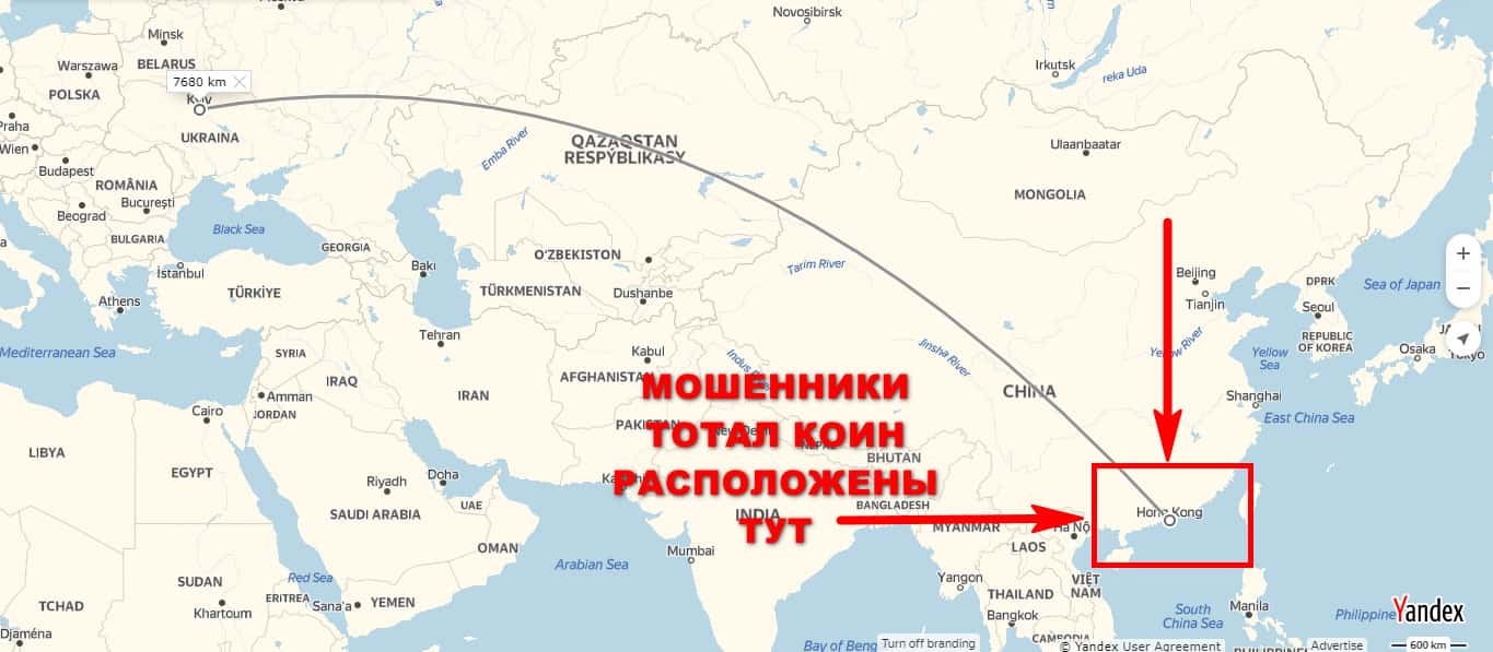 Мошенническая организация Тотал Коин использовала некоторые лазейки, чтобы не нести ответственность перед клиентами. Жулье закинуло свою регистрацию в оффшорный Гонконг и управляет мошеннической деятельностью именно оттуда. Если будете с ними судиться - вот адрес: Level 7 World Trust Tower, 50 Stanley Street, Central, Hong Kong.