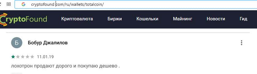 Далее представлен отзыв, в котором человек высказал свое мнение касательно работы криптовалютной конторы Тотал Коин. Оказывается это обычный лохотрон, который только и ждет, чтобы привлечь как можно больше клиентов, что бы забрать у них все. Не рискуйте и не пользуйтесь сервисом этих аферистов.