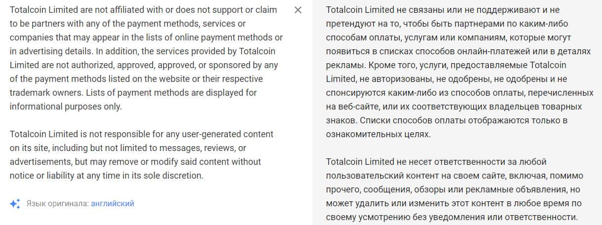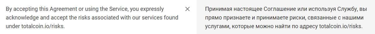 Обычная по сути обменка, под названием TotalCoin io, также не исключает варианты, что пользователь их услугами, может потерять все вложения. Аферисты не хотят нести ответственность за это, поэтому решили указать заранее эти ситуации. Так что если средства со счета пропадут, то пеняйте на себя.