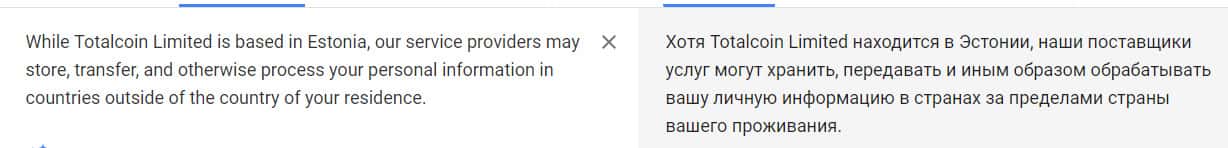 В политике конфиденциальности TotalCoin io также не все так просто, так как криптовалютные мошенники пытаются любыми путями увильнуть от ответственности, если произойдет утечка личных данных клиентов. Жулье указывает, что в любой момент есть ряд причин, почему они будут передавать данные третьим лицам.