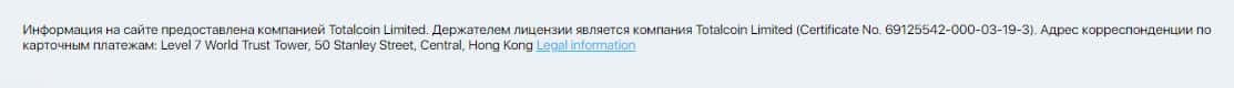 Как говорится на сайте конторы TotalCoin io, они находятся в Гонконге и поэтому придерживаются юрисдикции именно этого государства. Жулье вообще не упоминает никаких данных о регуляции и лицензии, так как считают, что с криптовалютой этого делать не нужно. Поэтому есть опасение, что положенные средства вернуть не удастся.
