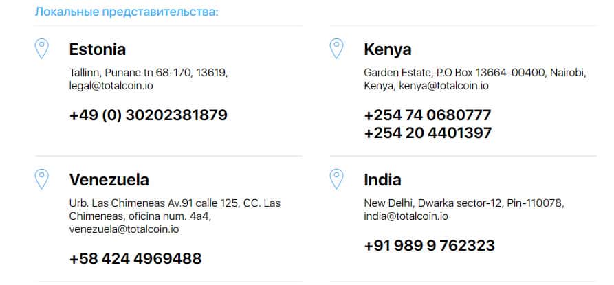 Далее представлены контактные данные региональных представительств по всему миру мошеннического лохотрона Тотал Коин. Как оказалось, аферисты заполонили многие страны, но не факт, что эти данные работают. Теперь по порядку советуем внимательно ознакомиться с этими контактами: