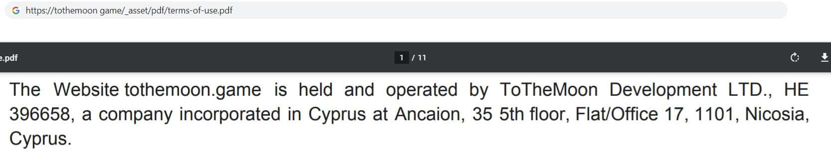 Компания финансовых кидал ToTheMoon Game указала, что зарегистрирована на Кипре, а это как известно идеальное место для финансовых мошенников, так как все лохотроны зарегистрированы именно там.
