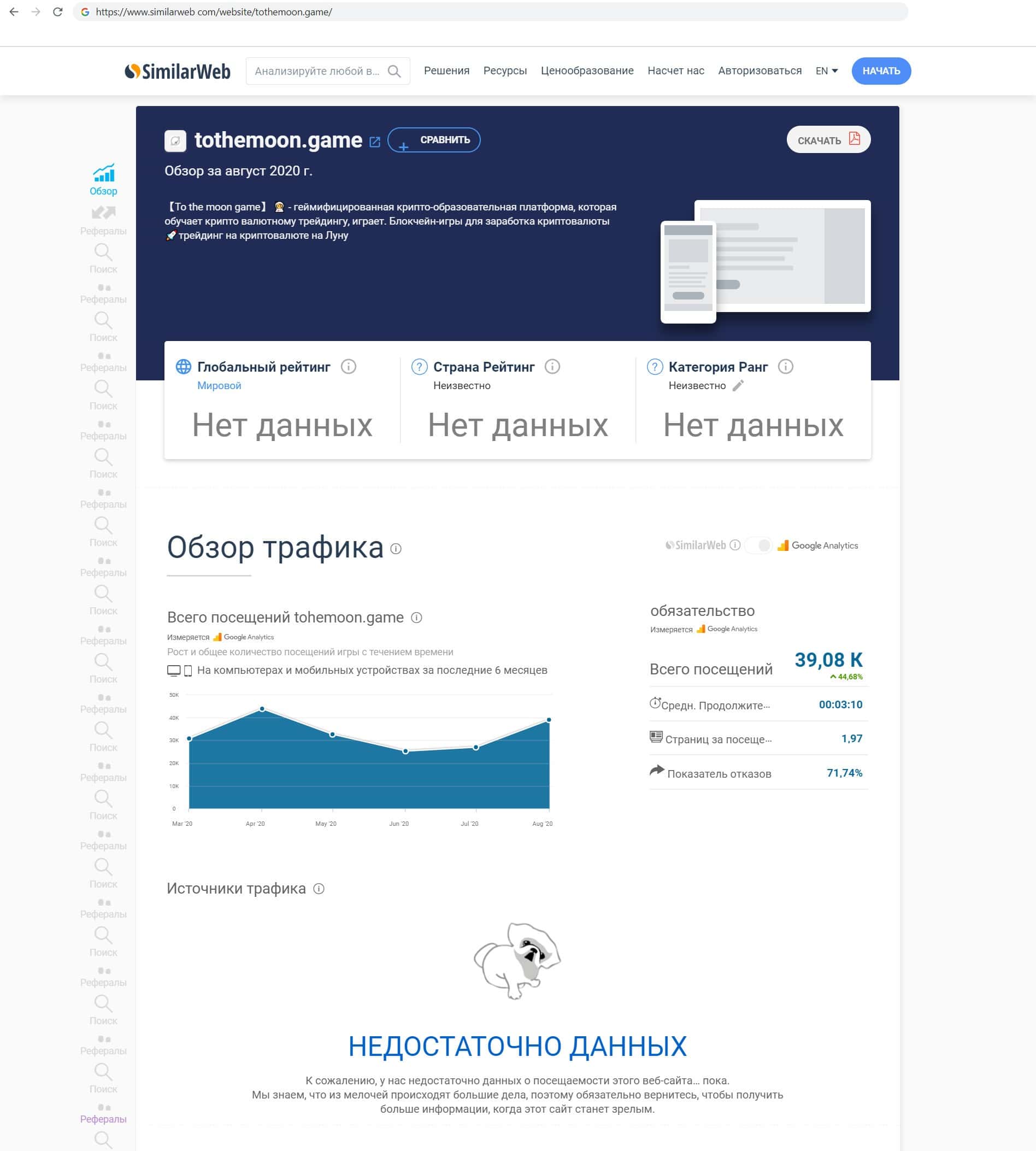 С помощью сайта similarweb com мы хотели узнать информацию о трафике главного интернет ресурса разводил Ту Зе Мун Гейм, но международный сервис не обладает достаточным количеством информации о данном лохотроне.