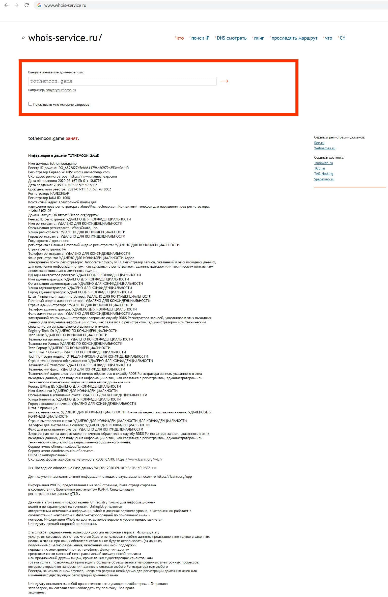 Через интернет ресурс whois-service ru мы хотели узнать владельца домена компании махинаторов ToTheMoon Game, но оказалось, что компания скрывает владельца своего домена.