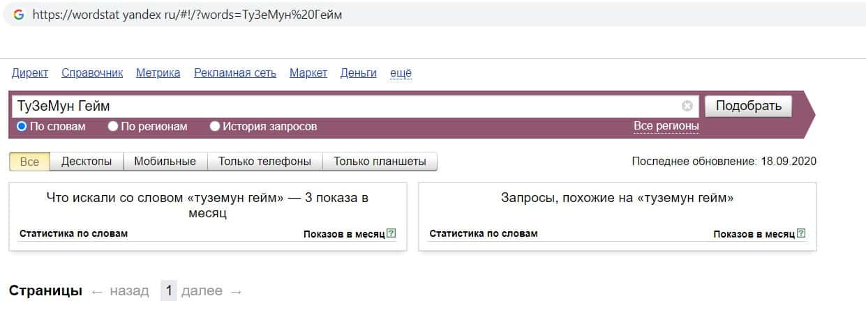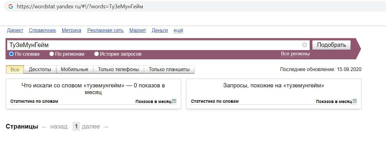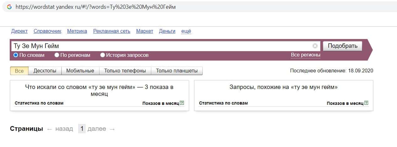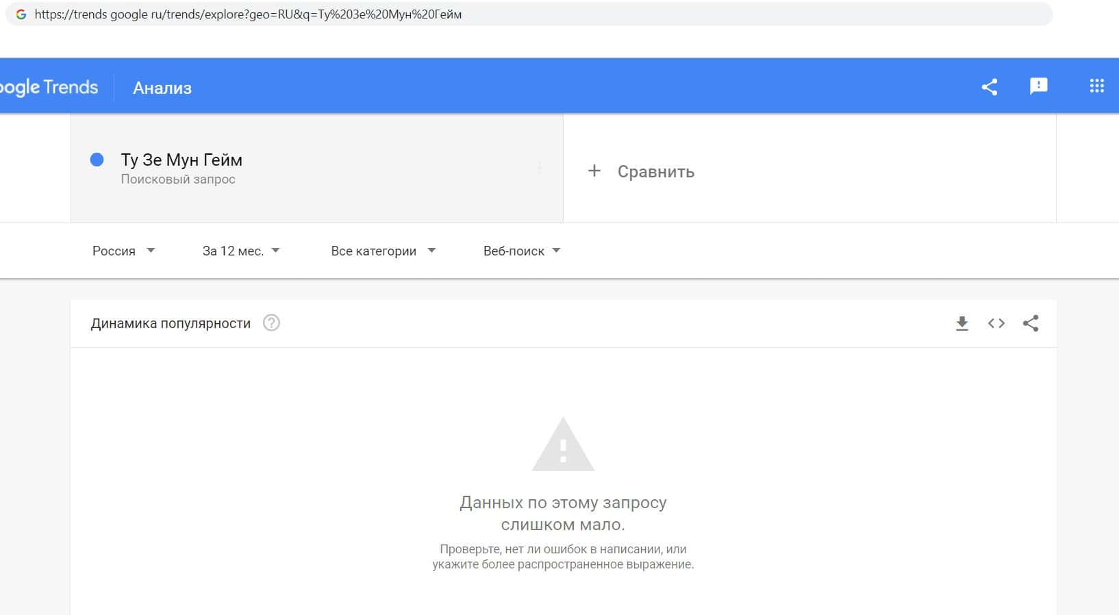 Ещё вы проверили количество запросов фирмы Ту Зе Мун Гейм по русскоязычному названию но с одним пробелом, а именно "ТуЗеМун Гейм". 3 раза пользователи выполнили этот запрос.