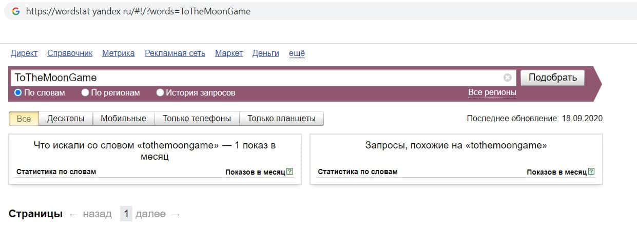 Так же мы проверили количество запросов фирмы ToTheMoon Game по названию компании без пробела, а именно "ToTheMoonGame". Всего 1 раз пользователи выполнили данный запрос.