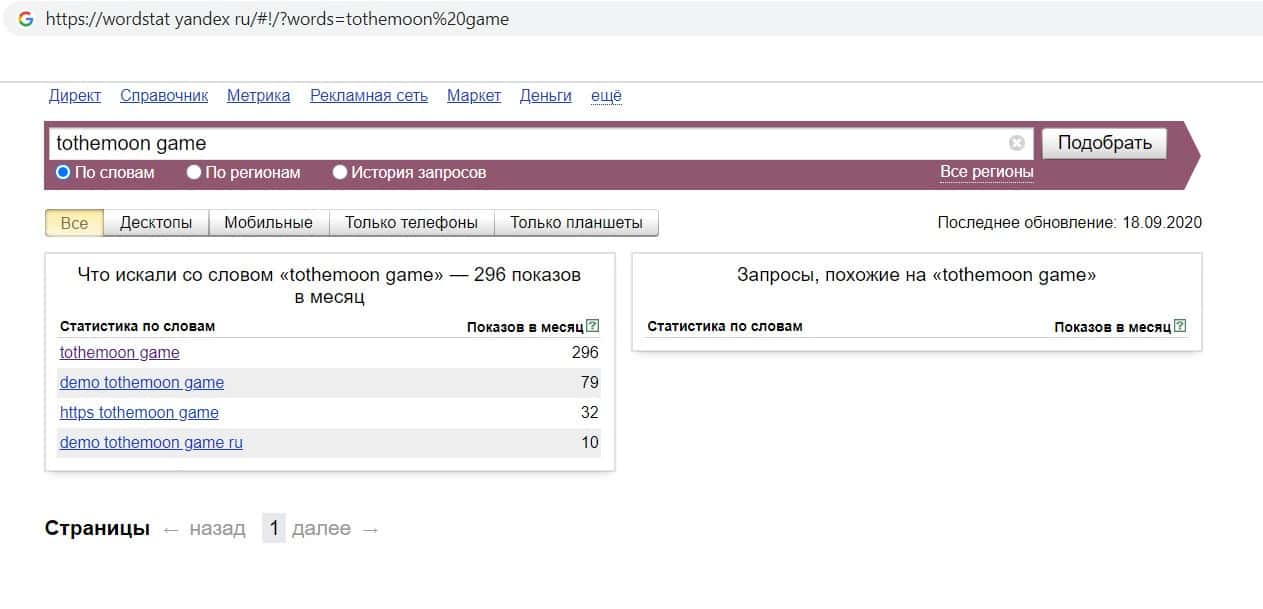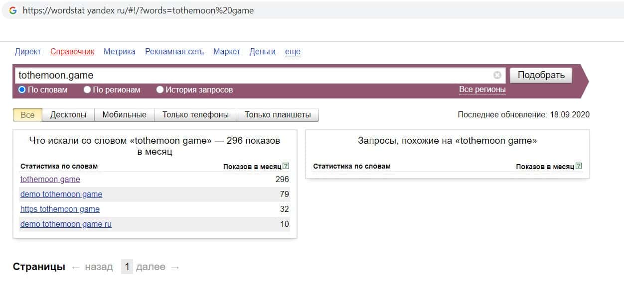 Проверили мы и количество запросов конторы Ту Зе Мун Гейм по домену фирмы без точки, а именно "tothemoon game". Этот запрос пользователи выполнили 296 раз за месяц.
