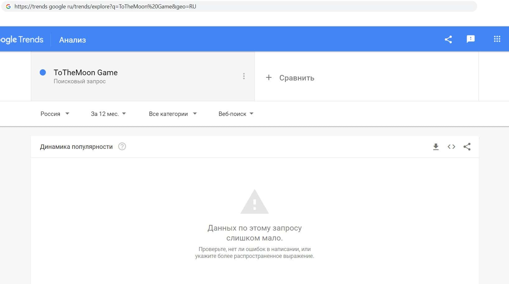 Мы проверили количество запросов компании аферистов ToTheMoon Game в Google по названию фирмы, а именно "ToTheMoon Game". Но оказалось, что данный запрос никто не выполнял.