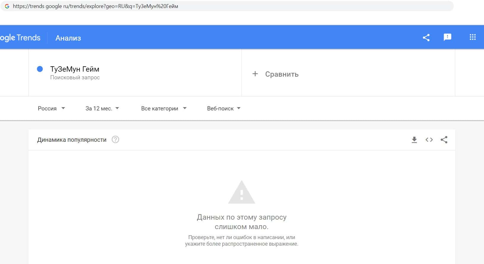 Мы проверили и количество запросов мошеннической конторы Ту Зе Мун Гейм по русскоязычному названию без пробелов, а именно "ТуЗеМунГейм". Но результата по прежнему нет.