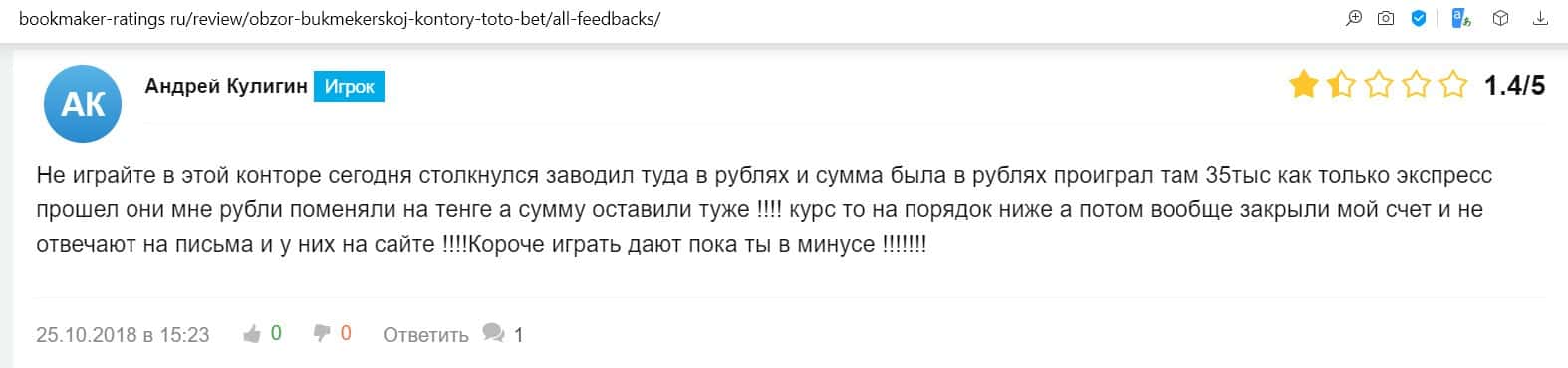 Андрей написал в своем отзыве о букмекере Тото Бет, что ему сконвертировали выплату, в результате чего он получил на порядок меньше, а потом вообще закрыли ему счет.