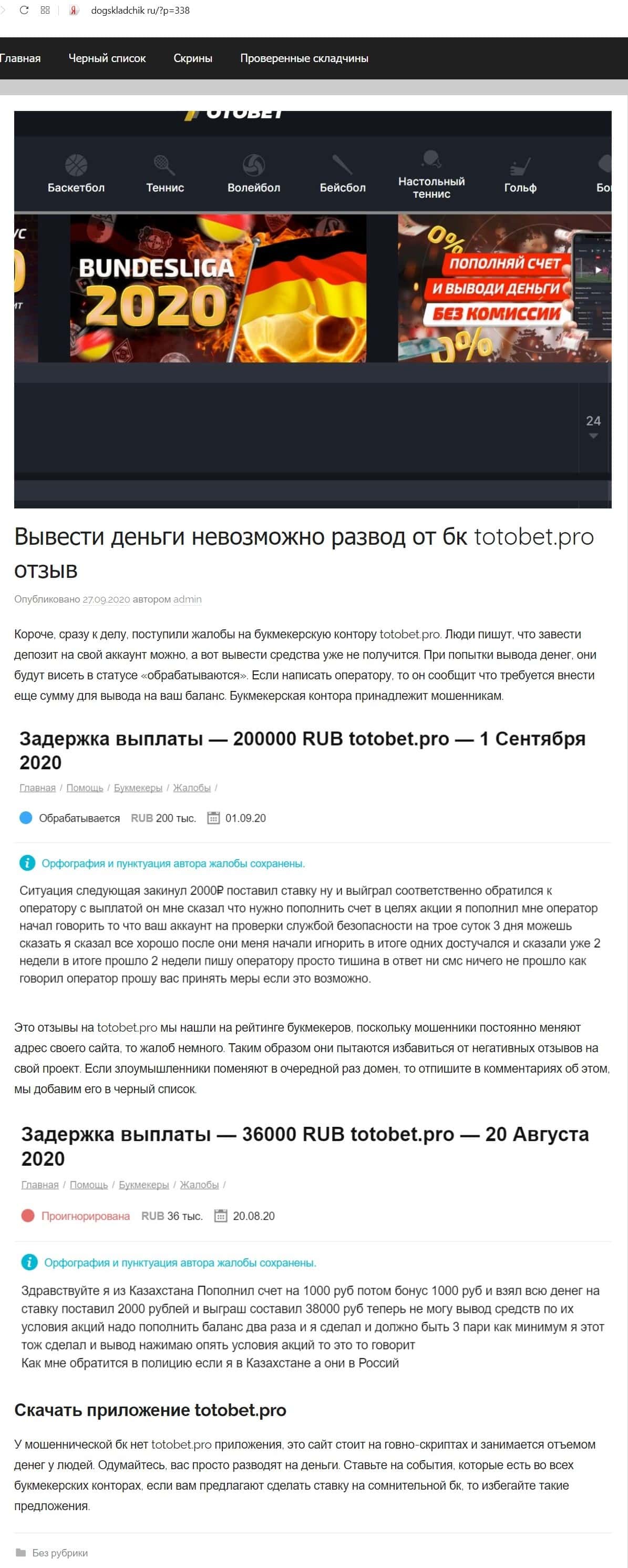 Сайт dogskladchik ru пишет, что букмекер Тото Бет нечестный, так как он не выводит деньги. В доказательство приводятся скрины жалоб от игроков, которых кинула данная контора.