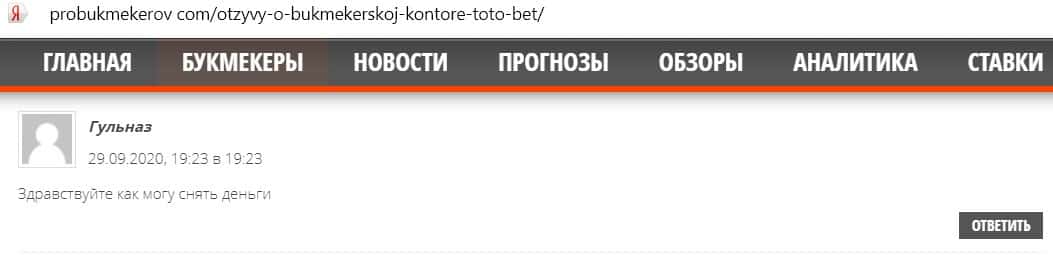 Гульназ спрашивает в своем комментарии на сайте Пробукмекеров, как можно снять деньги с сайта Тото Бет. У данного автора также проблемы с выводом, как и у других игроков.