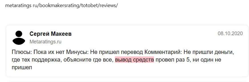Сергей пишет в отзыве на сайте Метатрейдингс, что букмекер Тото Бет не выводит деньги. Он делал пять запросов, средства не поступили. Техподдержка не отвечает.