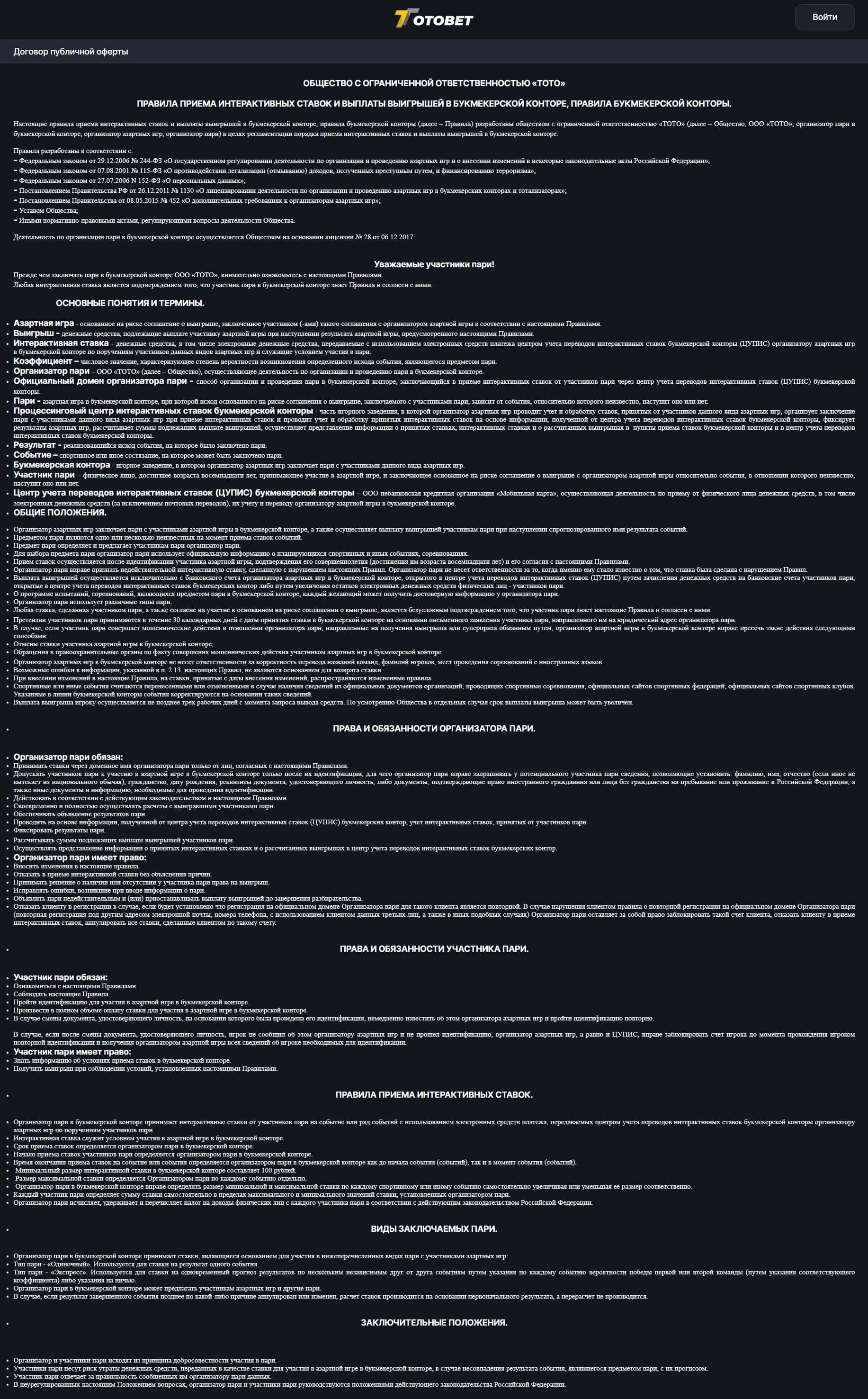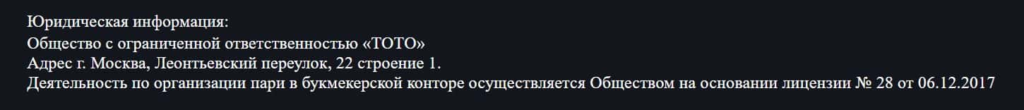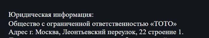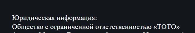 Юридическим лицом букмекера TotoBet Pro является организация Общество с ограниченной ответственностью «ТОТО», о чем написано в их договоре оферты.