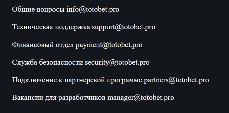 На сайте букмекера TotoBet Pro для связи с организацией имеется электронная почта. Пользователь может выбрать, на какой адрес писать, в зависимости от его вопроса.