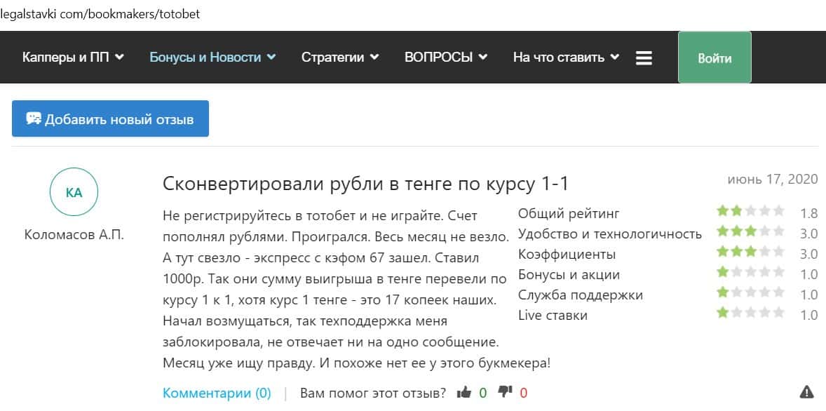 Мужчина написал, что БК Тото Бет обманывает игроков. Он пополнял счет рублями, а выигрыш пришел в тенге 1:1, хотя тенге это всего 17 копеек. В итоге он остался не с чем.
