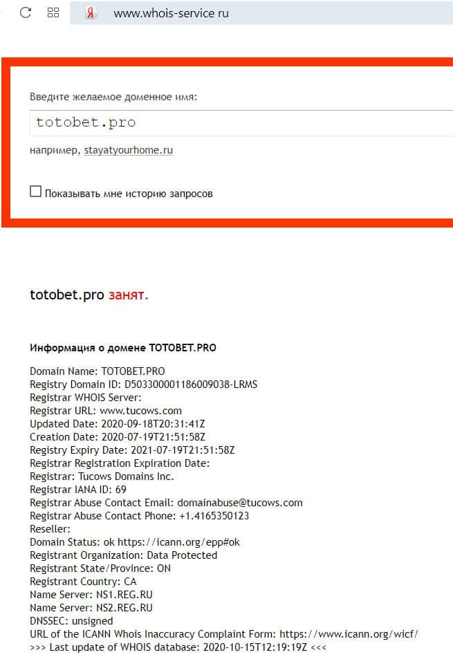 Возраст доменного имени сайта букмекера TotoBet Pro