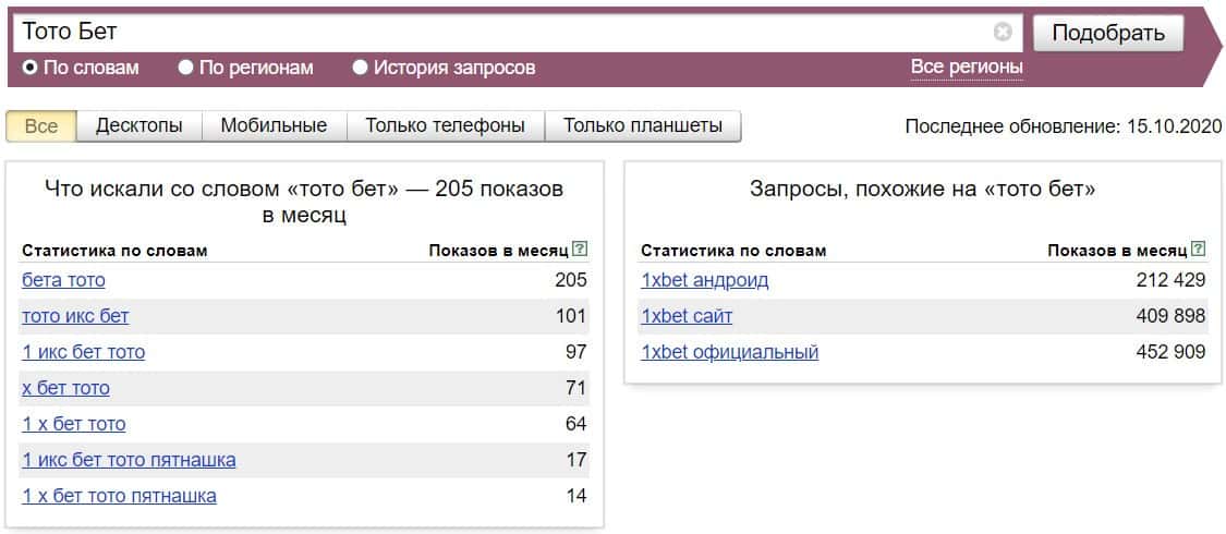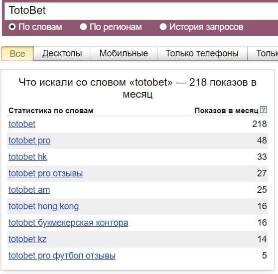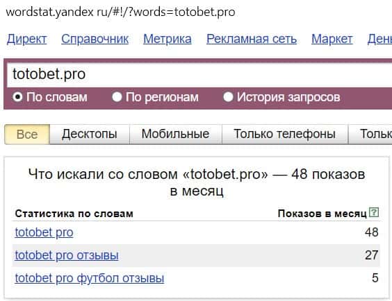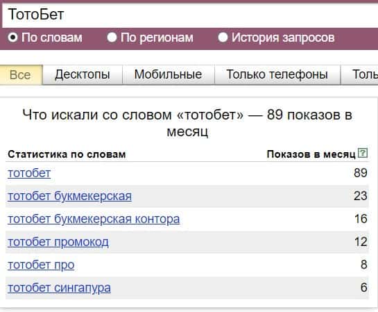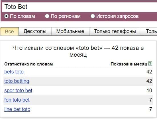 Название бренда "ТотоБет" на русском языке без пробела люди искали в системе Яндекс не очень часто, результат равен 89 показам.