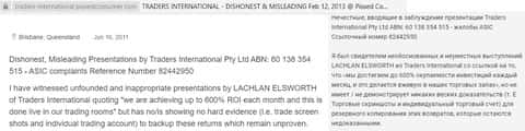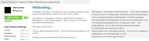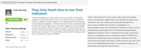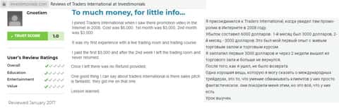 Пользователи, зачастую западные, оставляют подробные отзывы о сотрудничестве с Traders International. По части обещаний данные шулера идут впереди планеты всей. По отзывам же видно, что когда дело доходит до реального обучения трейдингу, то тут Трейдерс Интернейшнл показывают весь свой непрофессионализм.