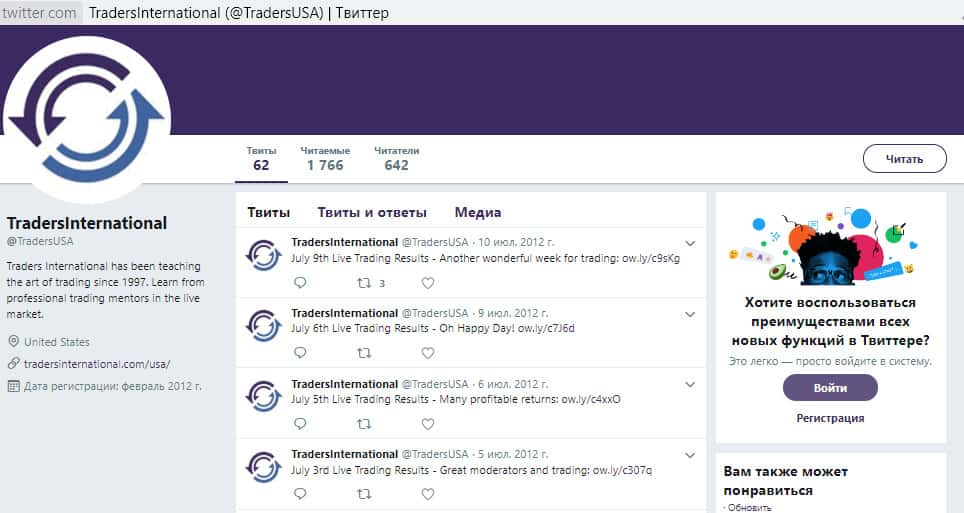 Конечно же, как и любые другие шулера, Трейдерс Интернейшнл не брезгуют пиаром своего хайп-проекта в социальных сетях. Имеются у жуликов аккаунты как в популярнейшей социальной сети Facebook, так и в не менее популярной Twitter. Эти же социальные сети нужны для видимости взаимодействия с пользователями.