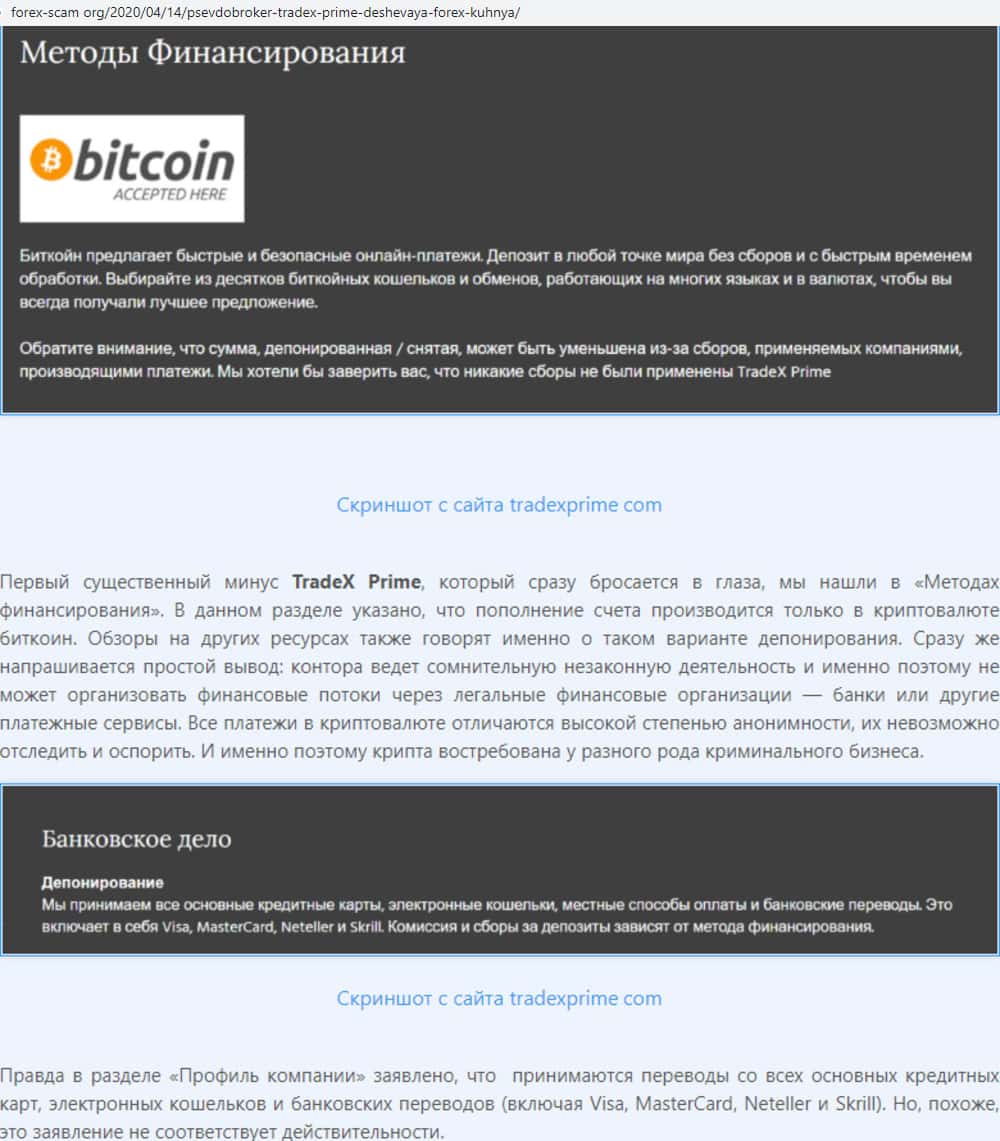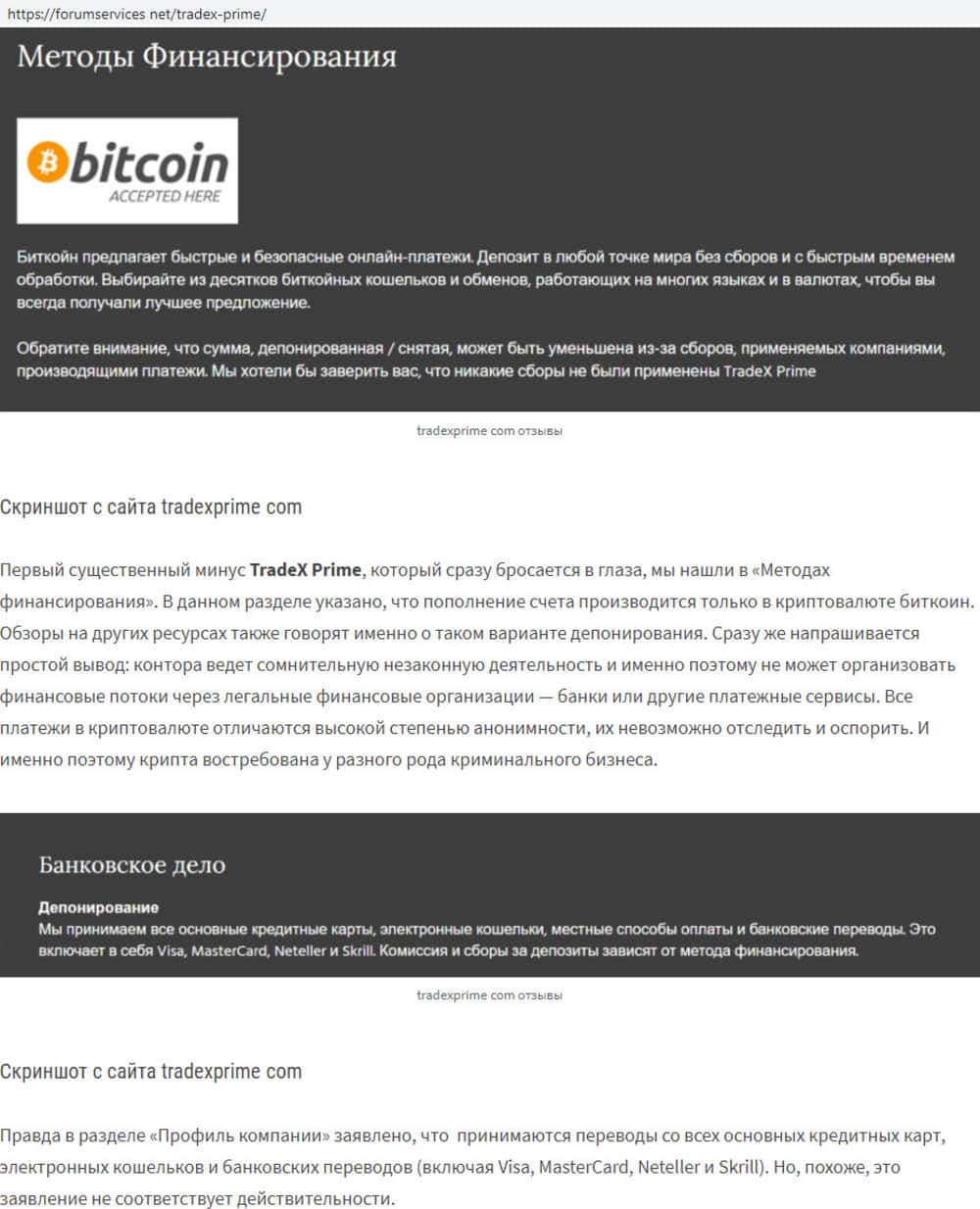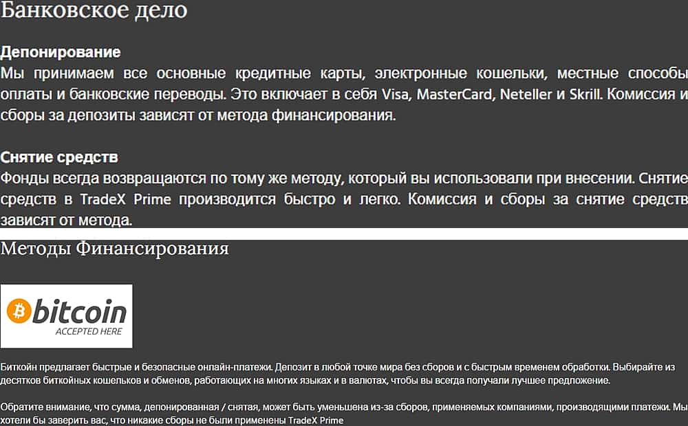 Лживую и противоречивую информацию на подвальном ресурсе TradeXPrime можно встретить практически везде. Например, аферисты TradeXPrime утверждают, что имеют множество вариантов для приема и вывода платежей. На деле же лохотрон TradeXPrime заточен только для приема депозитов через анонимную криптовалюту Биткоин.