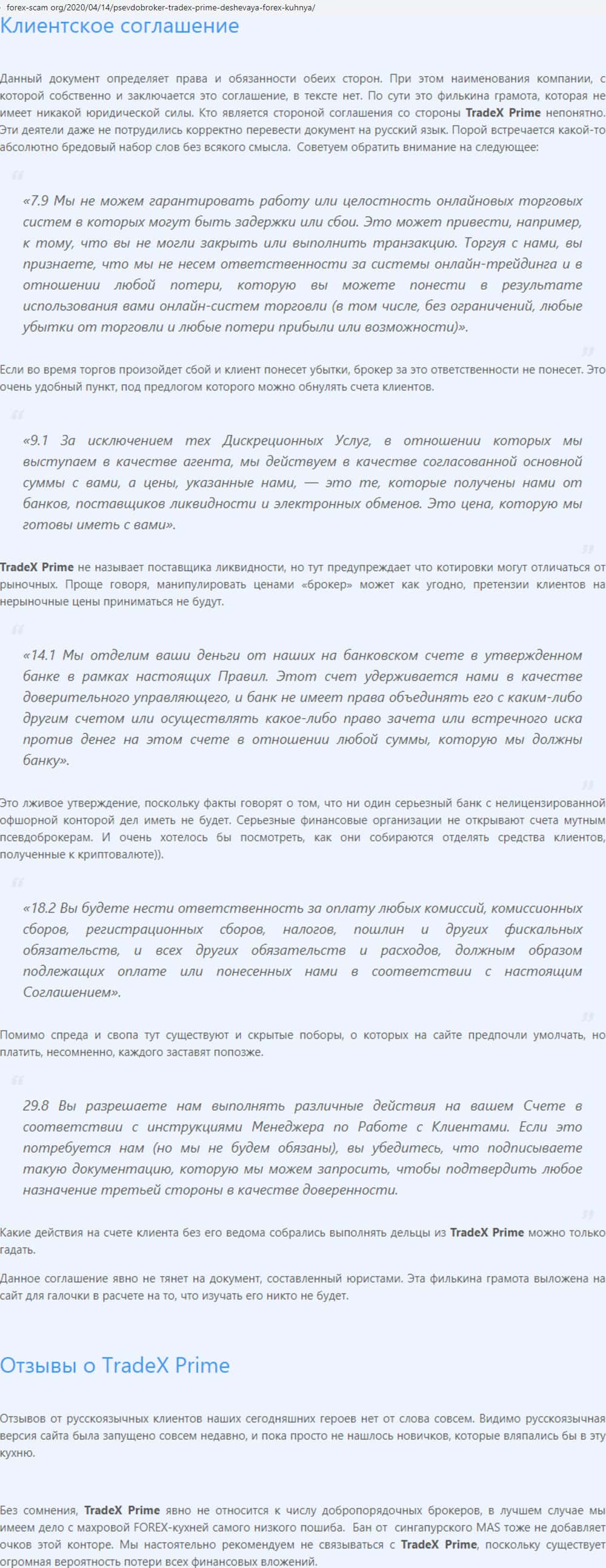 Клиентское соглашение пройдох TradeXPrime является сплошной филькиной грамотой. Присутствует кривой русскоязычный перевод, который еще больше путает пользователя в смысле псевдодокумента. Некоторые пункты все же удается понять и их содержание - это настоящее минное поле для начинающего трейдера.