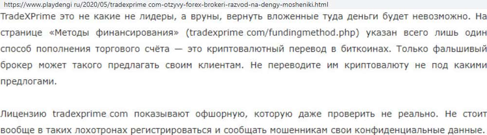 У мошенников явные проблемы с безопасностью платформы и счетов, а переводы от жертв они получают только в биткоинах. Поскольку этот метод предполагает анонимность, трейдеру будет практически невозможно доказать, что он вообще что-то переводил. Другие способы пополнения счета, вопреки уверениям авантюристов TradeXPrime, не работают.