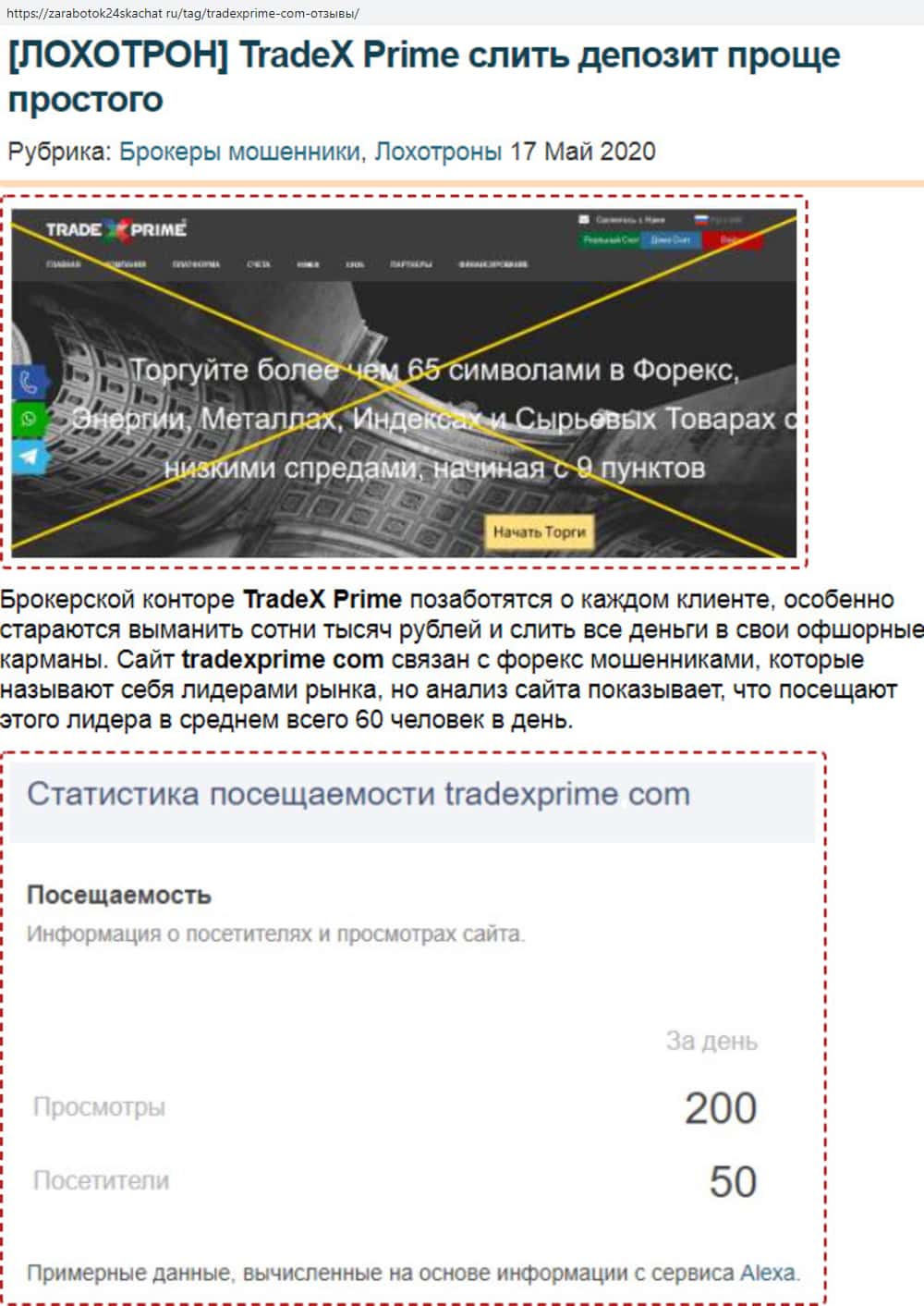 Еще один портал, посвященный разоблачению лохотронов, zarabotok24skachat ru, обратил внимание на биржевую аферу Трейд Икс Прайм. Пока жулики не пользуются особой популярностью, их сайт просматривают около 60 человек в день. Поэтому для них важно развести трейдера хотя бы на минимальный взнос, чтобы украсть его.
