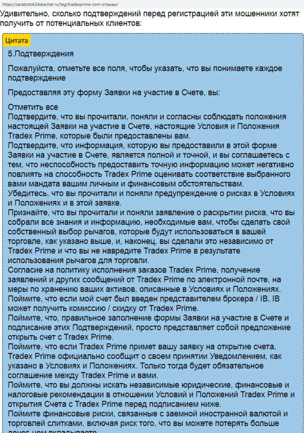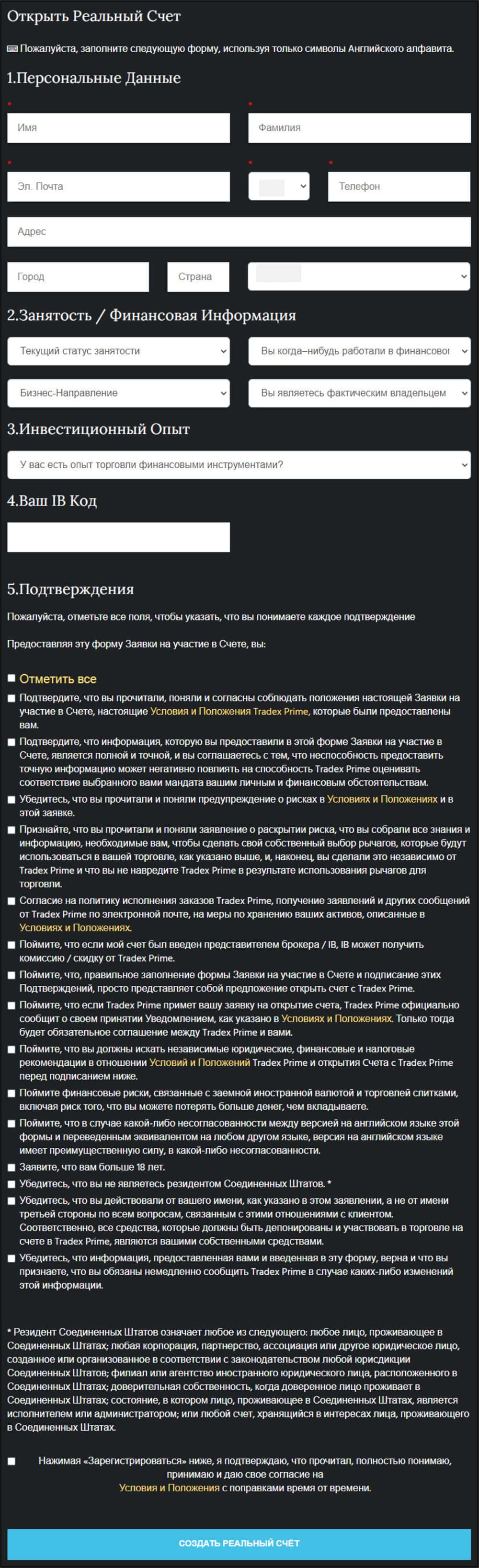 Чтобы создать так называемый реальный счет, внебиржевые разводилы TradeXPrime создали настоящую форму-динозавра. Помимо более подробной информации, необходимо соглашаться с огромным количеством пунктов подтверждения. Здесь снова на руку финансовым аферистам TradeXPrime играет кривой перевод на русский язык.
