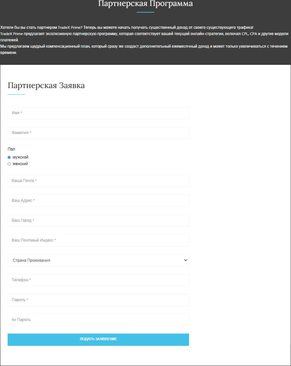 Для завлечения жертв в свое форекс-болото, каталы Трейд Икс Прайм создали партнерскую программу. В ней все довольно просто - приведи клиента, получишь часть его слитого депозита. Единственное, что смущает, так это количество информации, которое запрашивают шарлатаны Трейд Икс Прайм для участия в этом беспределе.