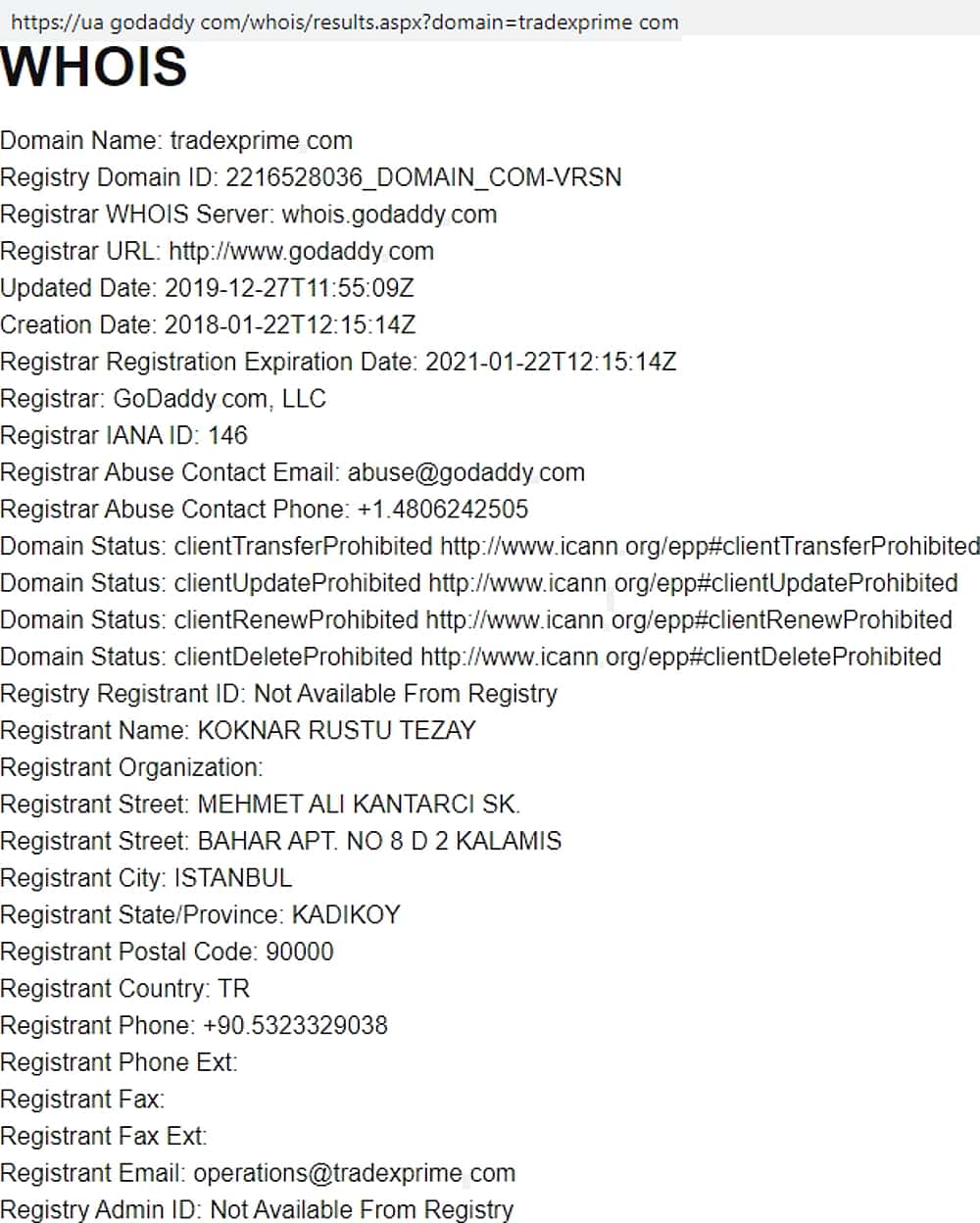 Сервис whois от регистратора гоудэдди ком при анализе домена прохвостов Трейд Икс Прайм показал, что связь этих двух проектов более тесная, чем просто сходство логотипов, названия и контактных данных. Владельцем доменного имени форекс-кухни Трейд Икс Прайм является житель Турции, который даже указал свои личные данные.