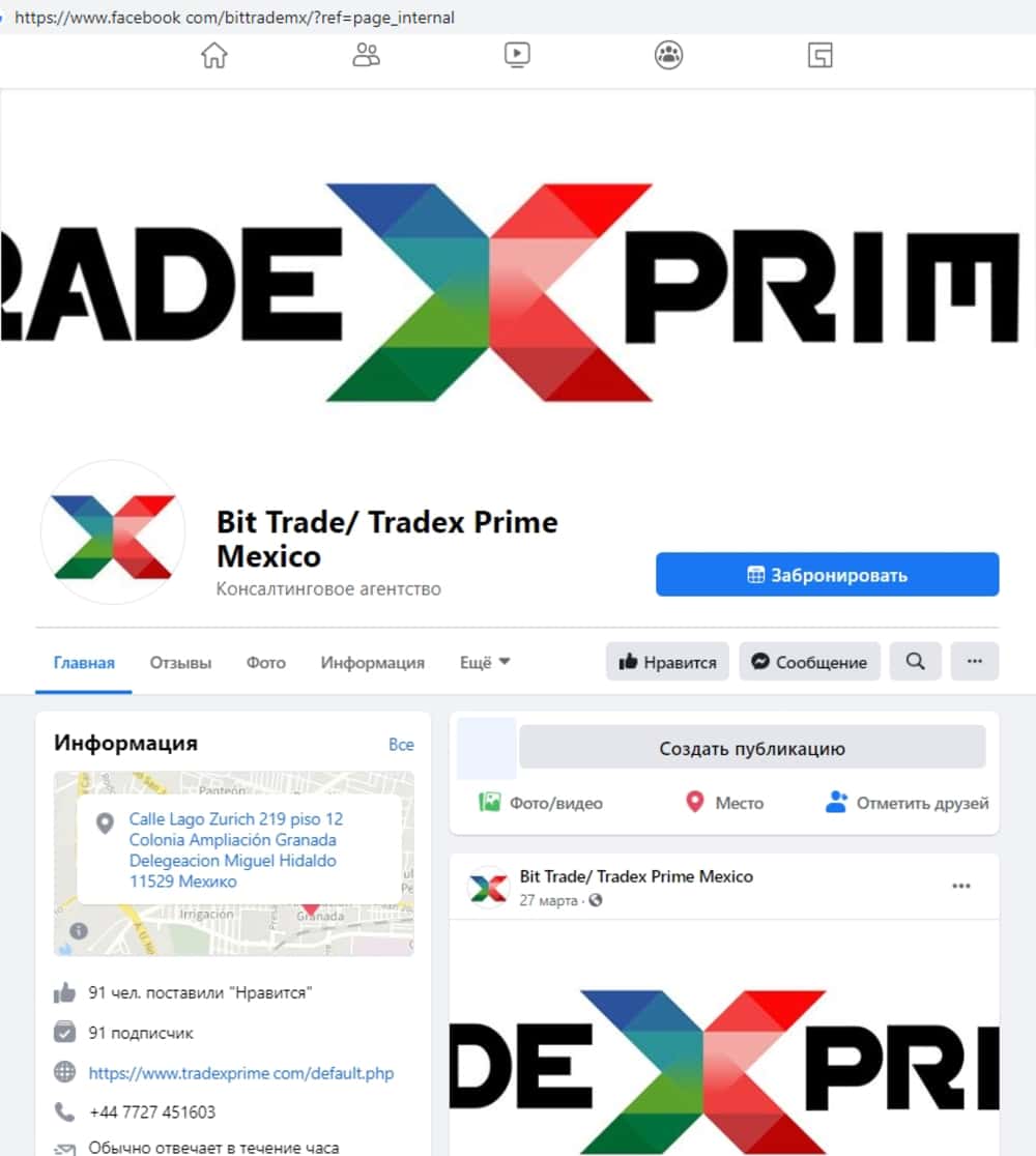 Прямых ссылок на группы в соцсетях на сайте болотных катал TradeXPrime нет. Но воспользовавшись поиском можно обнаружить паблик на платформе фейсбук ком, который имеет прямую ссылку на сайт аферистов. Судя по описанию этой страницы, принадлежит она некоему консалтинговому агентству в Мексике. Имеется даже адрес и номер телефона.
