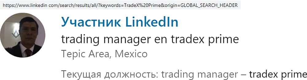 Социальная сеть для поиска бизнес-контактов линкедин ком, тоже помогла в поиске сотрудников онлайн-кухни TradeXPrime. Конечно скрываться жулики TradeXPrime умеют очень хорошо, поэтому разыскать удалось только одного предполагаемого члена коллектива разводного брокера TradeXPrime. Вот этот вероятный сотрудник: