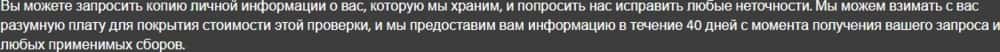 Плутовская контора Трейд Икс Прайм в одном из пунктов своей антиполитики конфиденциальности указывает, что получить информацию о себе, либо внести в нее изменения, услуга вовсе не бесплатная. Очень похоже на то, что после разрыва договора с конторкой Трейд Икс Прайм, свои личные данные еще придется и выкупать.