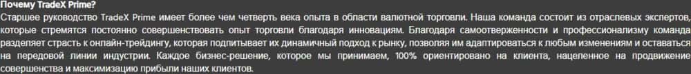 Разводилы TradeXPrime не желают показывать свое руководство, как и коллектив. Вместо этого опять очередное бла-бла-бла о некоем несуществующем старшем руководстве с 25-летним опытом, об отраслевых экспертах и команде профессионалов. Подобное описание можно встретить на странице любого финансового лоходрома.