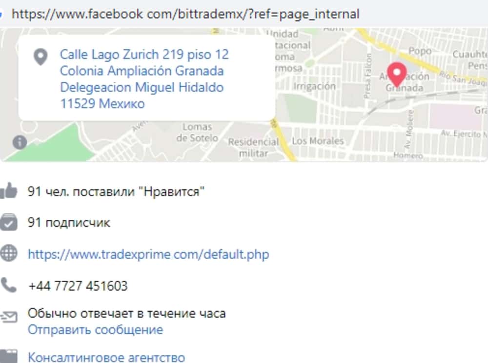 В предполагаемой группе, которая разместилась на популярной социальной платформе фейсбук ком, данные для связи с мошенниками Трейд Икс Прайм немного отличаются от представленных на недосайте катал Трейд Икс Прайм. Скорей всего телефон и адрес принадлежат некому недофилиалу шараги, который расположился в Мексике: