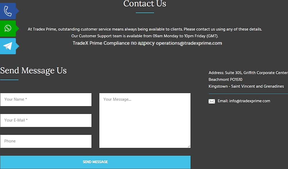 Для связи с собой шулера Трейд Икс Прайм предложили мессенджеры Telegram и WhatsApp, а также два почтовые ящика, форму обратной связи и адрес на банановых островах. С одной стороны, казалось бы этого достаточно, но если присмотреться, то понимаешь, что все это лишь односторонняя связь, которая в любой момент может оборваться. Контакты кидал:
