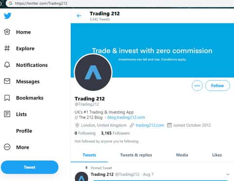 Имеется у лохотрона Trading 212 и страница в социальной сети Twitter, где аферисты Трейдинг 212 раскошелились только на несколько тысяч подписчиков, которые аналогично предыдущей странице мошенников Trading 212 в социальной не проявляют на аккаунте лохотрона Трейдинг 212, что и не удивительно, ведь он создан чисто для "виду". Итак: