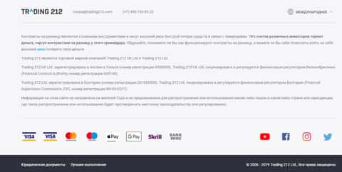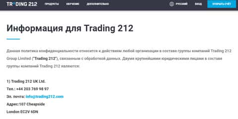 Под контакты аферисты Trading 212 не отводили отдельного раздела своего сайта, а предпочли попросту разбросать их по разным разделам своего сайта. Самих же контактов у мошенников Трейдинг 212 довольно маловато, что определенно говорит об их не особом желании лишний раз выходить на связь с клиентом. Ниже перечислим контакты шулеров Trading 212:
