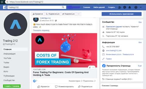 Страницы лохотрона Трейдинг 212 в социальных сетях