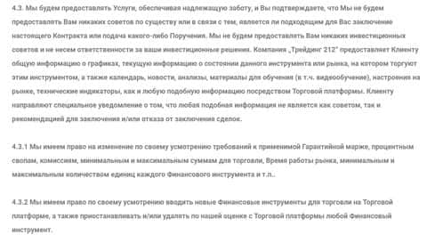 После шулера Trading 212 говорят о том, что они не несут ответственности за предоставляемую ими же инвестиционную информацию, а так же за убытки, которые понесли клиенты мошенников Трейдинг 212 непосредственно в результате их использования. На изображении, расположенном ниже, вы можете увидеть окончание условий шулеров Trading 212.