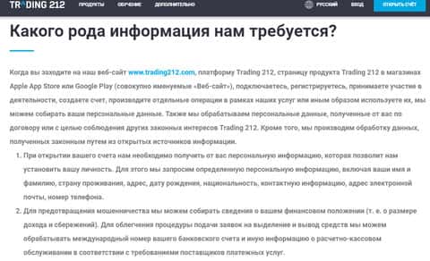 Далее в политику конфиденциальности у аферистов Trading 212 уже следует информация о том, что мошенники Трейдинг 212 собирают личную и персональную информацию своих пользователей, однако в ее объеме никакой конкретики не приводится. На изображении, расположенном ниже, вы можете увидеть очередной раздел политики конфиденциальности жуликов Trading 212.