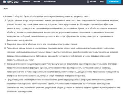 После в политике конфиденциальности у аферистов Trading 212 следуют цели сбора информации наивных пользователей, которым не повезло связаться с мошенниками Трейдинг 212, которые подаются под предлогом различных исследований жульем Trading 212. На изображении, расположенном ниже, вы можете увидеть очередной раздел политики аферистов Трейдинг 212.